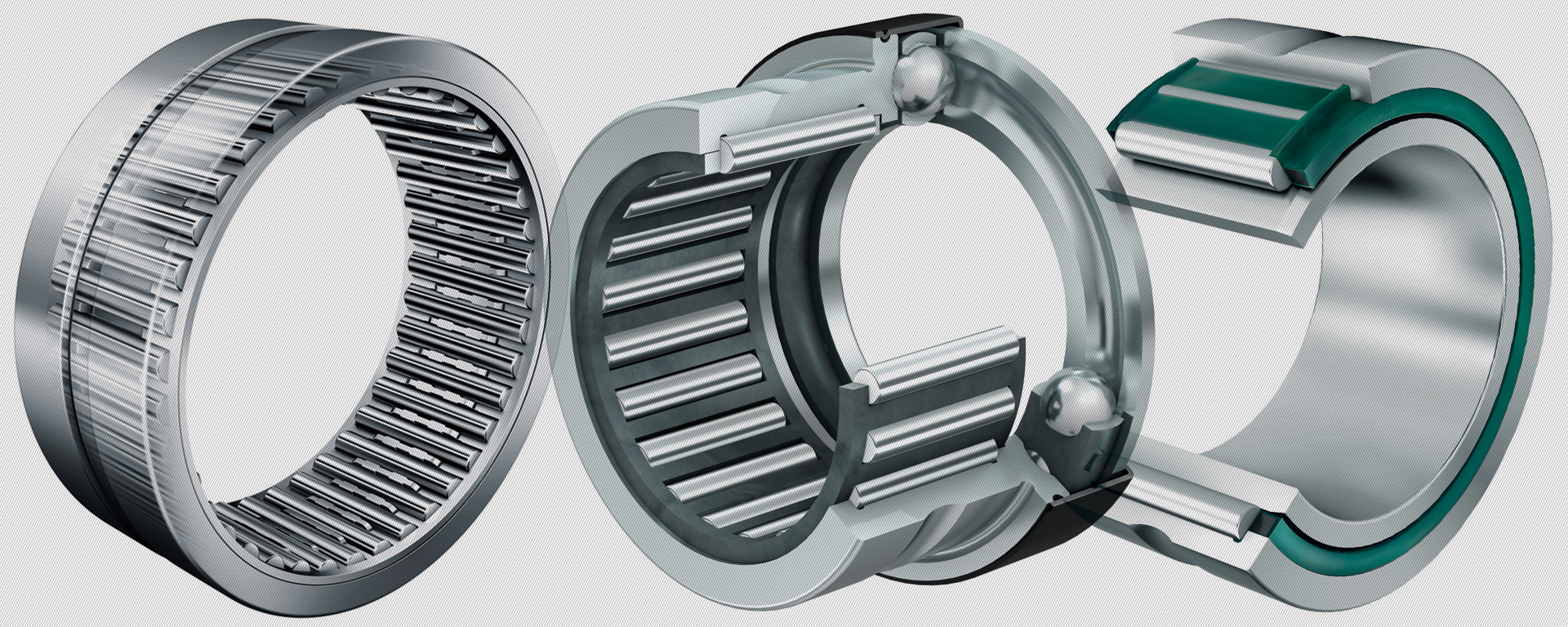 組合滾針軸承由徑向滾針軸承和推力軸承共同組成。 它們能同時(shí)承受徑向和軸向載荷。 在應(yīng)用中,當(dāng)其它類型的定位端軸承配置占用太多空間或者軸向載荷太重、轉(zhuǎn)速太高或帶簡易止推墊圈的軸承配置潤滑不足時(shí),尤其適合使用組合滾針軸承。 提供的組合滾針軸承有以下幾種基本設(shè)計(jì):